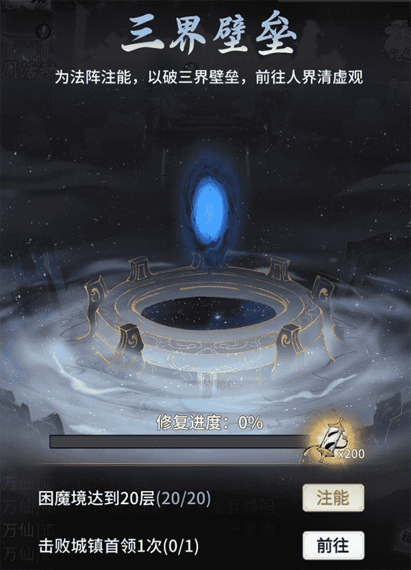 当你修为达到返虚/破虚中期后,,,可在城镇寻得芸丫并激活神秘法阵,,通过收集材料、、击败首领等方式为法阵注能,,借以打破三界壁垒,,,,开启支线剧情“清虚旧梦”