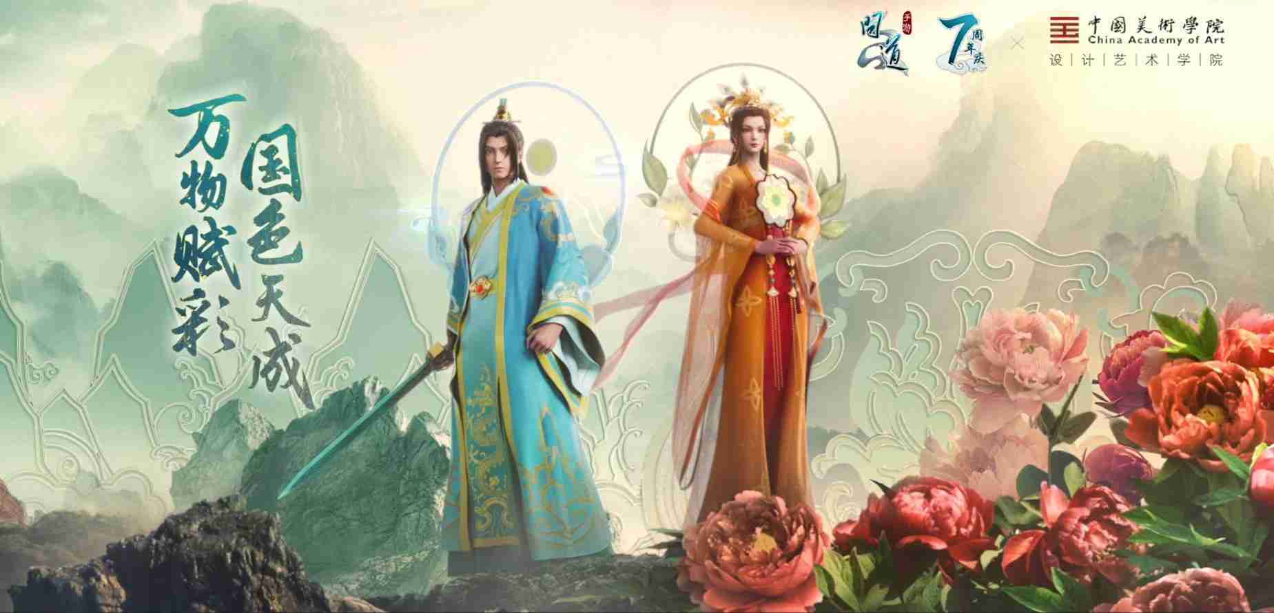 2023年4月,,《问道手游》联动中国美术学院,,,在游戏中融合了中国历史上不同时期的文化元素,,,,打造了“山河万象”与“凤鸣九霄”的国风时装。。。在色彩配置方面,,,,创作团队基于对游戏角色特性的分析提取相应的文化内涵,,从每一种色彩的色相、、、、指代事物和情感出发对应角色属性,,,,选定服装的色彩搭配。。。在纹样设计方面,,,,创作团队结合游戏角色自身特殊的造型比例和形态,,,,在实际的纹样设计中进行了游戏语境下的活化演绎。。男性角色集中使用了如蟒纹、、、、海水江崖纹、、、如意纹和云气纹等传统纹样元素,,女性角色则吸纳了凤凰纹、、牡丹纹、、、、卷草缠枝纹等元素,,,,组成以“双凤牡丹纹样”“缠枝牡丹纹”“金玉凤冠头饰”为主要纹样的游戏角色装饰图案系统。。