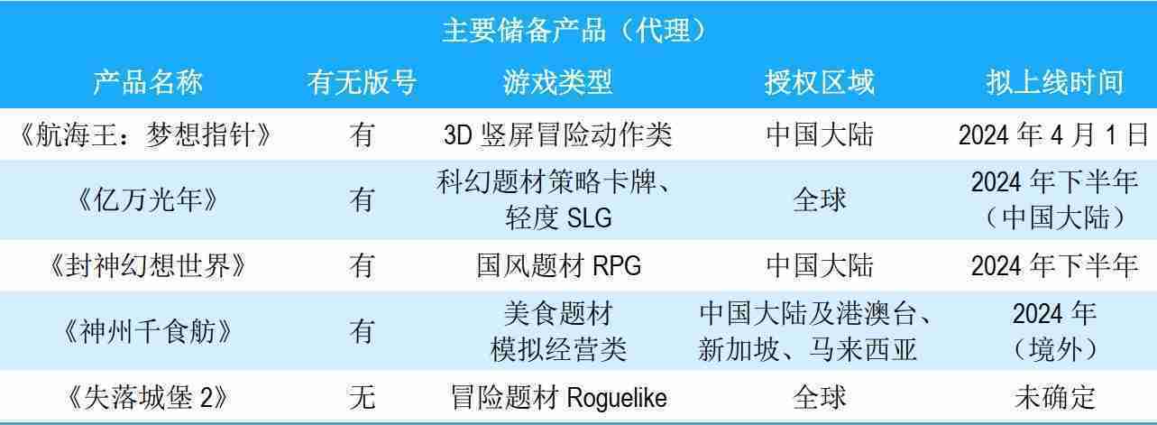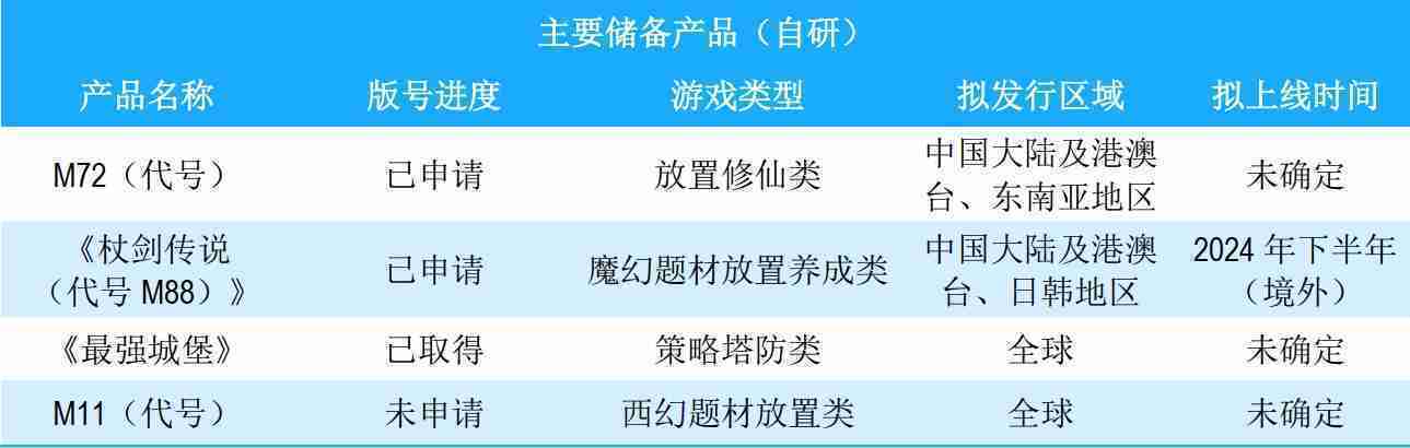 公司储备的多个自研、、、、代理产品都在有序推进当中,,,,涵盖放置类、、、策略类、、模拟经营类、、、RPG、、、Roguelike等多元化游戏品类,,,,储备的主要自研和代理产品如下::::